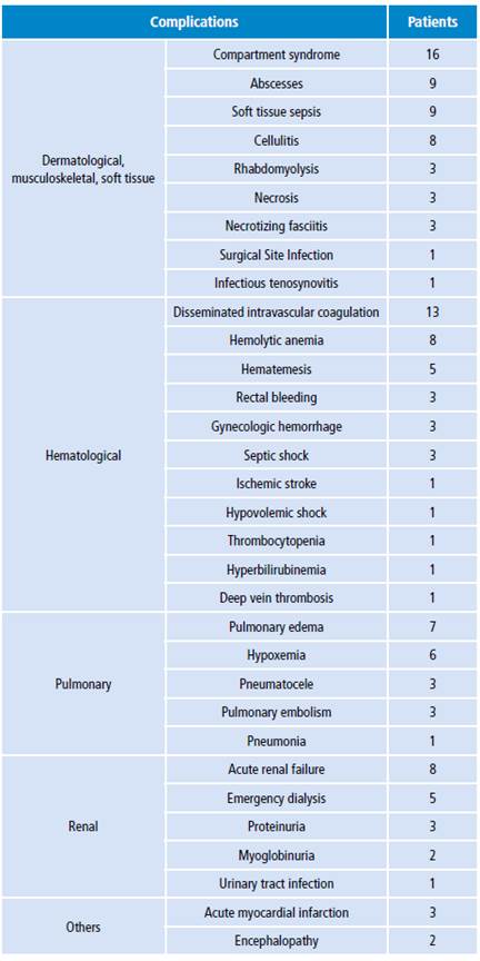 76% of the patients presented some complications, being more frequent hematological and dermatological alterations (25%). The moderate stage included 42% of patients with complications, of which compartment syndrome was the most frequent, followed by dermatological, hematological and musculoskeletal alterations, while patients in severe stage presented multisystemic complications (hematologic, renal and pulmonary) by 33%. Table 3 shows the main complications observed by groups and those observed at least once in patients.
