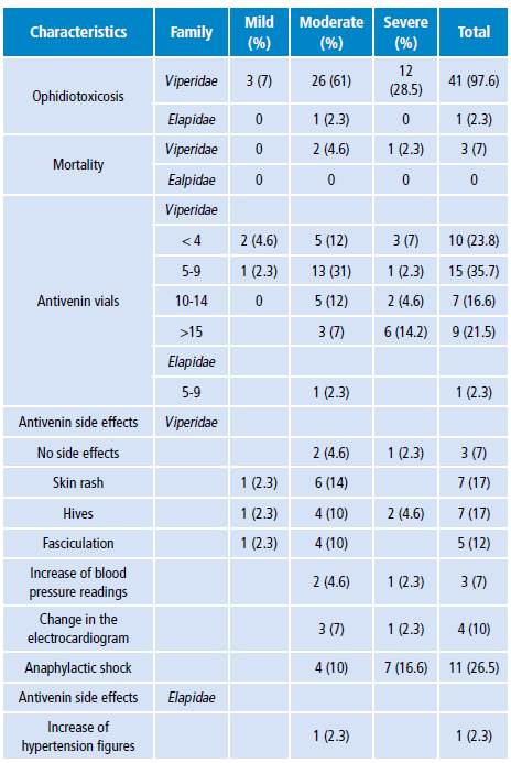 After receiving the authorization from the Ethics Committee, a format was used to collect information regarding the patient's sex, age, geographical area where the bite occurred, occupation, previous morbidities, bite history and use of antiophidic serum, treatment prior to hospital admission, anatomical location of the bite, time of evolution of the condition, time elapsed between the bite and the administration of the antivenin serum, requirement of hospitalization and admission to the intensive care unit, classification of the severity of the ophidic accident, number of days of antibiotic treatment, need for surgical management, complications, antivenin serum side effects, paraclinical evolution of the patient, and alarming signs and symptoms at admission and discharge, such as findings on vital signs, pain, hemorrhages, neurological symptoms and fever.