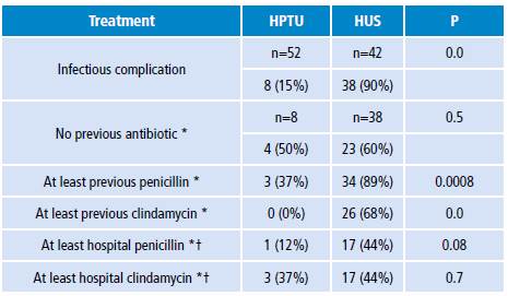 Additionally, a statistical comparison was made based on hospitals, taking into account the frequency of patients treated with penicillin or clindamycin prior to admission and, at in-hospital level, prior to culture (Table 5). Greater frequency was observed in the use of the recommendation at the HUS, but also greater infectious complications, at hospital level, were found with a statistically significant difference compared to the HPTU.