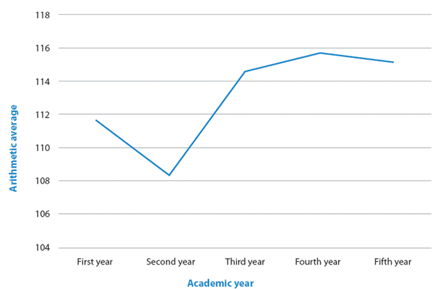 The essential differences were statistically evident between the second year and the third, fourth and fifth years. Given the absolute value of each of the means presented in Table 2, it can be clearly seen that the third, fourth and fifth year averages are higher than the second year average, and that absolute values are higher for the fourth and fifth years.
