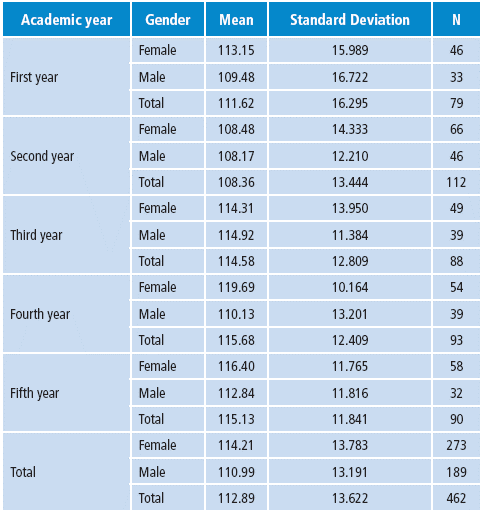ANOVA results were significant for "Academic Years" (Figure 1) and "Gender" (Figure 2): (p=0.001 and p=0.009, respectively), but their interaction was not significant (p=0.081).