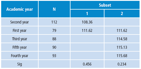 In the "Academic Year" factor, it was observed that the mean in the second year was relatively lower than in the first; however, from the third year onwards, empathy levels increased and remained relatively constant. Table 2 shows that, according to Tukey's test, there are two groups of means: the first is made up of the means obtained for the first and second years (no statistical differences between them, therefore, they can be considered equal), and the second group with the means of the first, third, fourth and fifth year (with no statistical differences, therefore, they can be considered equal to each other).