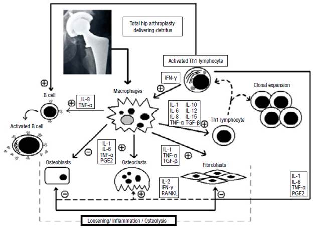 The detritus activates the macrophages to produce proinflammatory cytokines, which are potent stimulators of bone resorption, through direct and indirect stimulation. Such cytokines stimulate local factors that increase the bone resorption rate. They also induce the production of pro-collagenases by connective tissue cells, thus activating osteoclasts. Osteolysis associated with HP loosening is produced by osteoclasts and enzymes (cytokines, growth factors and prostaglandins).