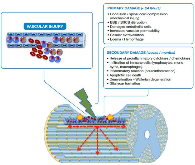 In primary damage, it is possible to observe a vascular rupture in the focus of the injury (epicenter) with extravasation of erythrocytes, neutrophils and lymphocytes; disruption of the blood-brain barrier (BBB) and blood-spinal cord barrier (BSCB) is also observed. In secondary damage, there is infiltration of inflammatory cells and the immune system with release of cytokines, chemokines and adhesion molecules that cause the injury to spread in a centrifugal way, increasing its radius. Apoptotic and aponecrotic cell death occurs with involvement of myelin (demyelination), cellular debris, activation of the phagocytic activity of macrophages and barrier formation, known as glial scar, which creates a hostile environment that prevents or delays axonal repair.