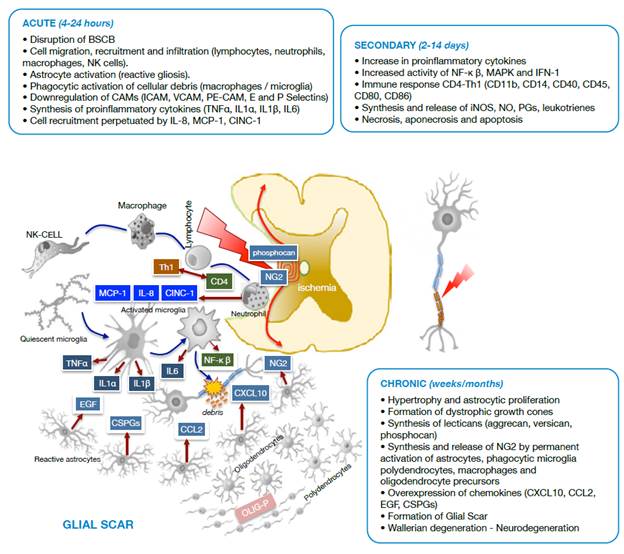 During the acute phase, an adverse medium arises, dominated by migration and infiltration of NK cells, neutrophils and macrophages that mediate inflammatory and immune processes through molecules such as MCP-1, CINC-1, IL-8, produced by neutrophils and the Th1 isoform from activated CD4 lymphocytes. It is worth noting that astrocytosis (reactive gliosis) and microglia activate to forms with phagocytic activity and cytokine synthesis (TNFα, IL1α, IL1p and IL6).