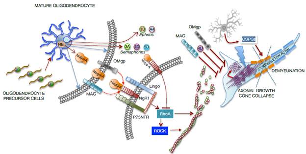 The axonal growth cone collapses due to the direct effect of molecules from oligodendrocytes, such as myelin-associated glycoprotein (MAG) and oligodendrocyte myelin glycoprotein (OMgp), or due to the formation of the Nogo-A complex and the NgR1- P75NTR-Lingo receptor, which activate RhoA. In turn, the rho-associated protein kinase (ROCK) is activated to prevent the polymerization of actin microtubules, which severely compromise the axonal cytoskeleton. Moreover, oligodendrocytes release transmembrane semaphorins (3A, 4D, 5D) and ephrins (3B, A4), which are involved in growth inhibition and in axonal cone collapse. On the other hand, activated astrocytes (reactants) provide chondroitin sulfate proteoglycans (CSPGs) to the neuronal environment, causing damage to the actin cytoskeleton and demyelination as shown in Figure 3.