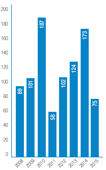 Figure 1: Number of cutaneous leishmaniasis cases reported per year in Boyacá, Colombia. 2008-2015.