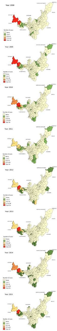 An analysis was made taking into account the geographical distribution of the cases reported in Boyacá between 2008 and 2015. A color scale was used: green for municipalities with 1 to 8 cases, yellow for 9 to 16 cases, orange for 17 to 24 cases and red more than 25 cases. To elaborate the maps with the geographic distribution of the patients affected by cutaneous leishmaniasis, the EpiMap extension of EpiInfo was used.
