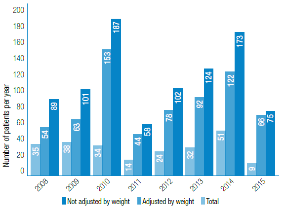 Figure 4: Pharmacological treatment with meglumine antimonate, calculated according to the guidelines of the Colombian Ministry of Health and Social Protection and discriminated by year in patients with cutaneous leishmaniasis from Boyacá, Colombia. 2008-2015.