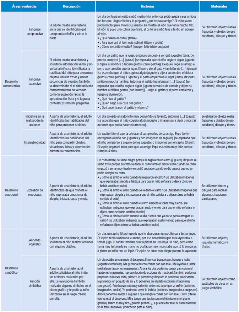Al niño también se le aplicó el protocolo de evaluación diseñado para este estudio (Tabla 1), el cual es de carácter cualitativo y considera necesario identificar la zona de desarrollo próximo, es decir, lo que puede hacer el niño en colaboración con el adulto. El protocolo de evaluación se aplicó en dos momentos: pre-test y posttest, cada uno con una duración de 30 minutos; el primero fue aplicado por una fonoaudióloga experta en desarrollo psicológico infantil y el segundo por una psicóloga del desarrollo infantil al finalizar la intervención con el fin de favorecer la objetividad en la obtención y análisis de los resultados. Como estrategia de evaluación se usó la narración 38 porque esta contribuye a organizar la experiencia del ser humano 39.