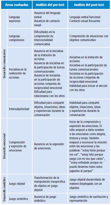 En la Tabla 4 se presentan los análisis del pre-test y del post-test de acuerdo a las áreas evaluadas. Se observó que en el pre-test el niño no respondía a las propuestas del adulto y le faltaba contacto visual. Después de la intervención la situación cambió, pues el niño logró involucrarse en las narraciones recreadas por la evaluadora y respondía a las preguntas e interacciones generadas por el adulto a través de los títeres.