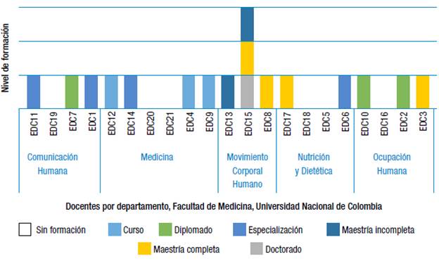 De la Figura 1 se resalta que el Departamento del Movimiento Corporal Humano es el que cuenta con más procesos de formación a nivel formal en educación, así como docentes con más altos niveles de formación en educación, maestría y doctorado. En contraste, el Departamento de Medicina mantiene una tendencia baja en formación en educación en escenarios pedagógicos formales.