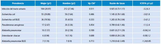 Se calcularon medidas de resumen e intervalos de confianza (IC) al 95% (Tabla 1). Los IC para las proporciones se hicieron bajo el estadístico p, se calculó la prevalencia de ITU y de cada microorganismo aislado y se comparó según el género. Se realizó la prueba de chi-cuadrado a las prevalencias de cada microorganismo. Además, se calcularon los IC95% para las diferencias de proporciones por género y se estimó la razón de tasas para las prevalencias de cada microorganismo (Tabla 2) mediante una regresión logística no condicional 13.