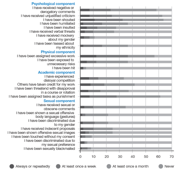 The study found that all participants had perceived some type of bullying at least once during the course of the internship. Regarding the psychological component, the most frequent types of bullying (at least once a month) were being shouted at (64/70), and receiving unjustified criticism (64/70) and negative or derogatory comments (59/70). In relation to the physical component, students reported being assigned excessive work (58/70); in the academic component, they were assigned tasks as punishment while others took credit for their work (both 62/70), and in the sexual component, students received sexual or obscene comments and were shown offensive sexual images (both 35/70) (Figure 1).