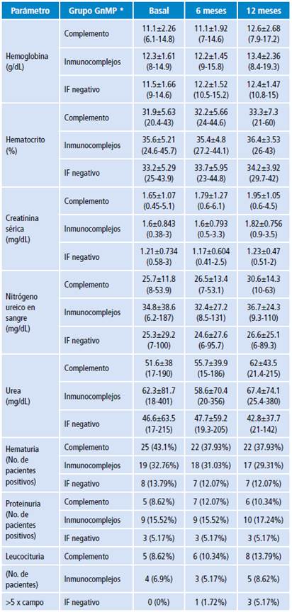 Tabla 1: Resumen de los principales parámetros clínicos a lo largo del seguimiento de acuerdo al grupo de glomerulonefritis membranoproliferativa.