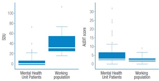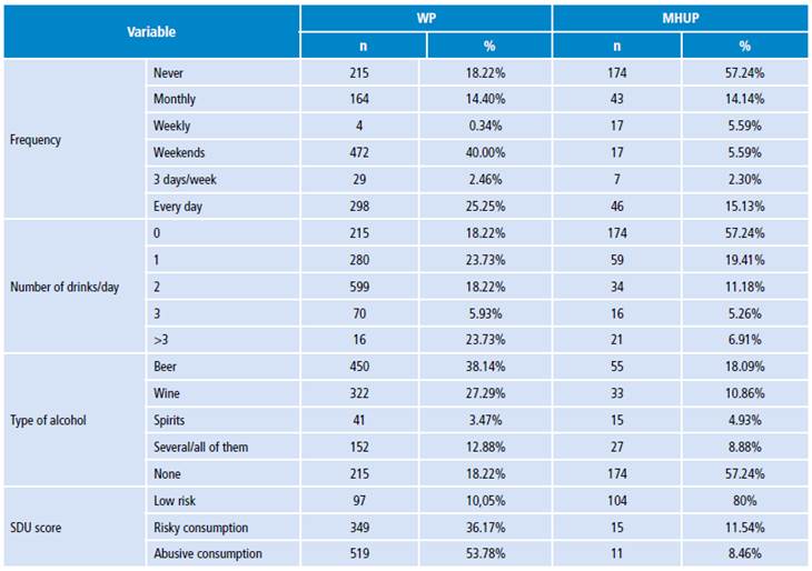 WP: working population; MHUP: mental health unit patients; SDU: standard drinking units. Source: Own elaboration based on the data obtained in the study.