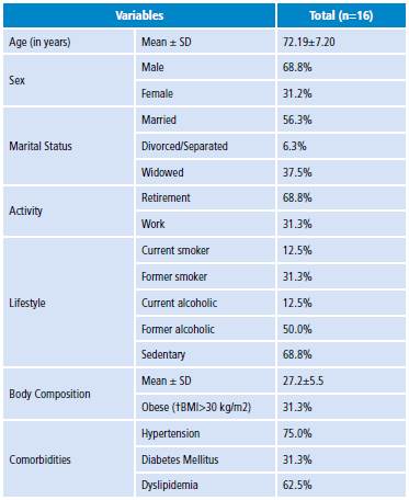 The total amount of patients from whom data were collected was 25, but 9 were excluded for not participating on the second phase of the research. The baseline data consisted of 16 patients (mean age 72.19±7.20 years) who met the inclusion criteria for the study. Most of the subjects were male (68.8%; n=14); married (53.3%; n=9), retired (68.8%; n=11) and sedentary (68.8%; n=11). The BMI indicated that approximately one third of the patients (31.3%; n=5) were obese (BMI>30kg/m2) (Table 1 ). In addition, half of the sample in the baseline had a family history of stroke and 6.3% (n=8) of the subjects had already had at least a previous ischemia.