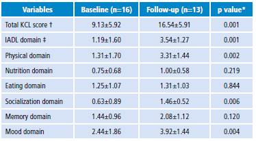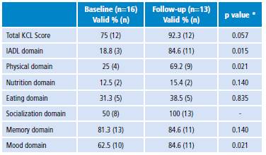 In agreement with the results presented in Table 2, there were statistical differences in the percentages of frail subjects between baseline and follow-up data collections. The percentage of frail elderly in IADL (p=0.015), physical (p=0.021) and mood (p=0.021) domains were higher after the stroke. Regarding the total KCL score, there was a tendency towards higher values in the follow-up period (p=0.057), while the socialization domain could not be statistically analyzed as all subjects were considered frail (100%) (Table 3).