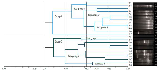 Regarding the results obtained through the BOX-PCR fingerprinting technique, out of23 K. pneumoniae isolates, 2 groups with a divergence greater than 50% were observed. In the first group, constituted by 12 isolates, 3 subgroups were identified: subgroup 1, with isolates 62 and 344; subgroup 2, with isolates 72 and 331, and subgroup 3, where isolates 73, 104, 102, 92, 332, 335, 330, and 112 were found. It is noteworthy that isolate 112 had a divergence greater than 50% in comparison with the other isolates of this subgroup. In addition, a 100% similarity between isolates 73 and 104 was observed, as well as between isolates 92, 332, and 335, while similarity among other isolates was less than 90% (Figure 3).