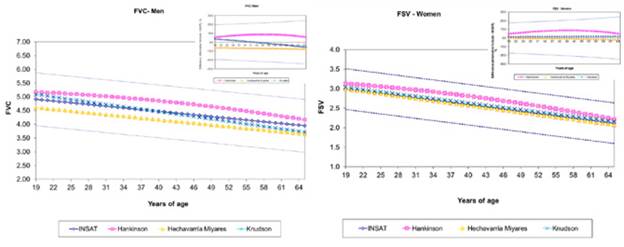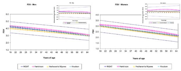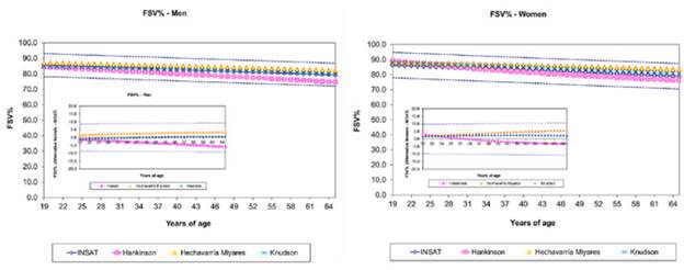 Finally, Figure 3 shows the behavior of the FEV% predictive equations according to the sex of the patient; the values estimated by the alternative equations were included within the 95% PI for the INSAT formula. Bias generated by the different examined equations was 0% for the equation presented in this paper, -2.4% for Hankinson et al. 6, 1.0% for Knudson et al. 7 and 3.3% for Hechavarría-Miyares et al. 17.
