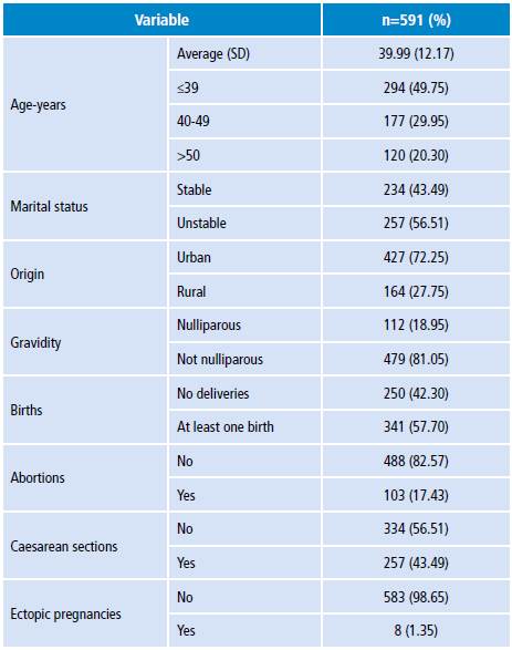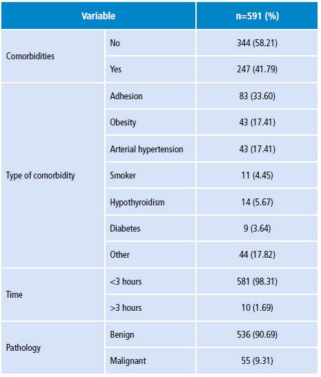 During 2015, 593 scheduled gynecological surgical procedures were performed in the HUSJ, of which two were excluded due to incomplete data, so 591 were included in the final analysis. The average age of the population under study was 39.99 years with a standard deviation of 12.17 years; 72.25% came from urban areas, 81.05% had at least one birth, 43.49% had a cesarean section and 1.35% had a history of surgical management due to ectopic pregnancy.
