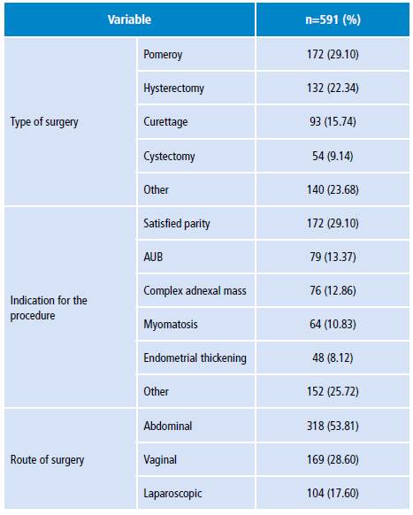 Regarding comorbidities, 58% presented at least one of them, the most frequent being adherent syndrome (33.6%), obesity and high blood pressure (17.4%). The most frequent surgical procedure was Pomeroy tubal ligation (29.10%), followed by hysterectomy (22.34%) and curettage (15.74%). Regarding the indication of the procedure, having enough children was the most frequent (29.10%), followed by abnormal uterine bleeding (13.37%), complex adnexal mass (12.86%) and myomatosis (10.83%). 98.31% of the surgical procedures lasted less than 3 hours. The most used surgical route was the abdominal with 53.81%, followed by vaginal and laparoscopic with 28.60 and 17.60, respectively. Benign pathology was the most frequent (90.69%) (Tables 1, 2 and 3).