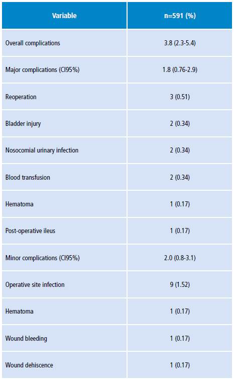 With respect to the main objective, it was found that the prevalence of complications was 3.8% (95% CI: 2.3-5.4); after classifying them, major complications pralence was 1.8% (CI95%: 0.76-2.9), while for minor complications it was 2% (CI95%: 0.8-3.1). Major complications included reoperation (0.51%), bladder injury (0.34%) and nosocomial urinary tract infection (0.34%), while minor complications were infection of the operative site (1.52%), hematoma (0.17%), wound hemorrhage (0.17) and wound dehiscence (0.17%) (Table 4). It should be noted that there were no deaths during the period studied.