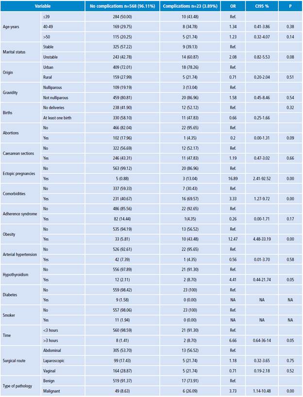 The bivariate analysis showed that having a history of surgical management of ectopic pregnancy was positively associated with complications (OR: 16.89, CI95%: 2.41-92.52); the same happened with having at least one comorbidity (OR: 3.33, CI95%: 1.27-9.72), of which only obesity had statistical significance (OR: 12.47, CI95%: 4.48-33.19). It was also found that malignant pathology was positively associated with complications (OR: 3.73, CI95%: 1.14-10.48), but with respect to surgery routes, no statistical significance was found for laparoscopic route (OR: 1.18, CI95%: 0.32-3.65) and vaginal route (OR: 0.71, CI95%: 0.19-2.18). The other variables analyzed did not show statistical significance (Table 5).