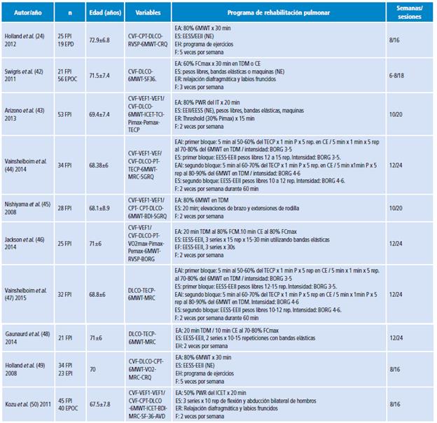 De los 70 estudios recuperados en la búsqueda, 10 cumplieron los requisitos de selección y todos incluyeron evaluación de la capacidad funcional a través del 6MWT. Las investigaciones en pacientes con FPI incluyeron entre 20 y 50 sujetos con edades >50 años; algunos de ellos incluían pacientes con enfermedad pulmonar obstructiva crónica (EPOC) y otras EPI. La intervención se realizó durante 8 a 12 semanas, 2 veces por semana con ejercicio aeróbico en cicloergometro o caminata durante 20 a 30 minutos, intensidad entre el 50-60% de la frecuencia cardiaca alcanzada en un test de carga constante o entre el 60-80% de la velocidad obtenida en el 6MWT. Además de ejercicio de sobrecarga para extremidades con banda elástica o pesas libres, se realizaron 2 a 3 series de 10 a 15 repeticiones en progresión, ejercicios de flexibilidad y de respiración. Solo un estudio incluyó evaluación y entrenamiento de la musculatura respiratoria con válvulas Threshold al 30% de la potencia inspiratoria máxima 43.