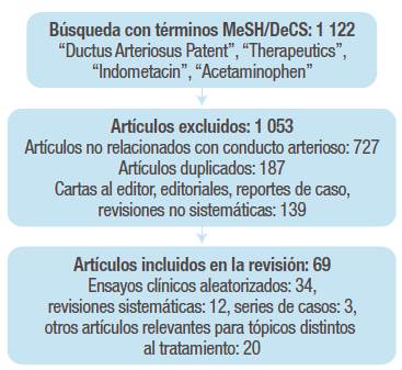 Se realizó una búsqueda estructurada de la literatura en las bases de datos ProQuest, EBSCO, ScienceDirect, PubMed, LILACS, Embase, Trip Database, SciELO y Cochrane Library con los términos: "Ductus Arteriosus, patentAND therapeutics"; "Ductus Arteriosus, patent AND indometacin"; "Ductus Arteriosus, PatentAND ibuprofen", y "Ductus Arteriosus, patentAND acetaminophen". La búsqueda se hizo en inglés con sus equivalentes en español.