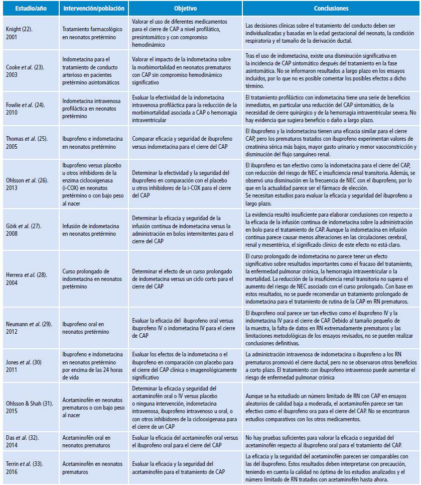 No existe consenso para realizar recomendaciones definitivas acerca del tratamiento del CAP en neonatos prematuros: la indometacina y el ibuprofeno parecen tener una eficacia similar, con mejores desenlaces renales en favor del ibuprofeno; por su parte, el acetaminofén, al parecer, tiene una eficacia similar al ibuprofeno, pero el tamaño muestral de los estudios es pequeño e insuficiente para realizar conclusiones definitivas al respecto. A continuación se describen los apartes relevantes que corresponden a cada fármaco.