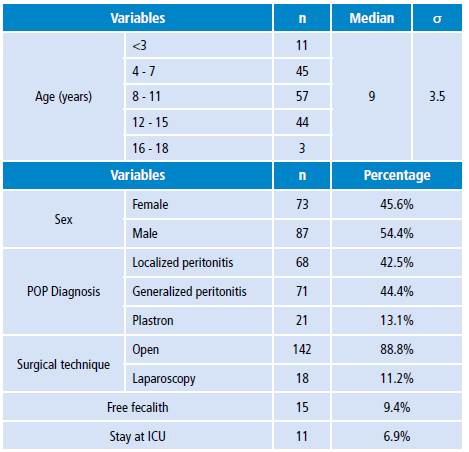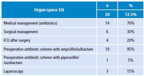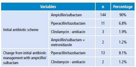 Initial post-operative antibiotic management included ampicillin/ sulbactam in 144 patients (90%); piperacillin/tazobactam in 11 patients (6.8%), which were taken to the ICU right after surgery; clindamycin and amikacin in 3 patients; and ampicillin/sulbactam and metronidazole in 2 patients (Table 2). The treatment of 13 of the children treated with ampicillin/sulbactam in the post-operative period was switched to piperacillin/tazobactam after OS-SSI diagnosis, and to clindamycin and amikacin in 2 patients due to an allergic reaction (Table 2).