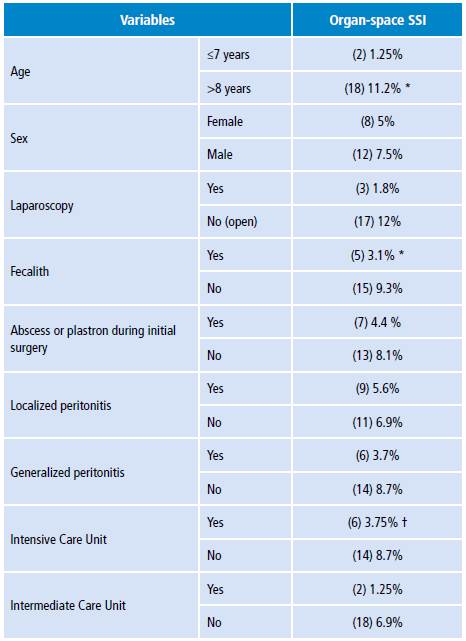 The percentage of patients ≥8 years with OS-SSI (17.6%) was 6 times higher than the <8 year-old group (3.4%, p<0.005). The presence of fecalith in the abdominal cavity was statistically correlated with OS-SSI in 33% of patients (p<0.005). Of the patients diagnosed with generalized peritonitis, 23% developed OS-SSI. 50% of patients hospitalized in the ICU right after surgery developed OS-SSI, while only 9.5% of patients hospitalized in the intermediate care unit and floors developed this infection (p<0.001). No case of mortality was documented.