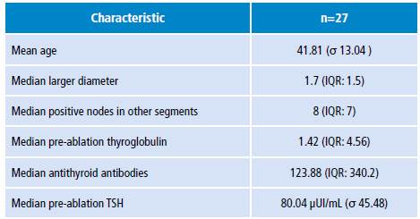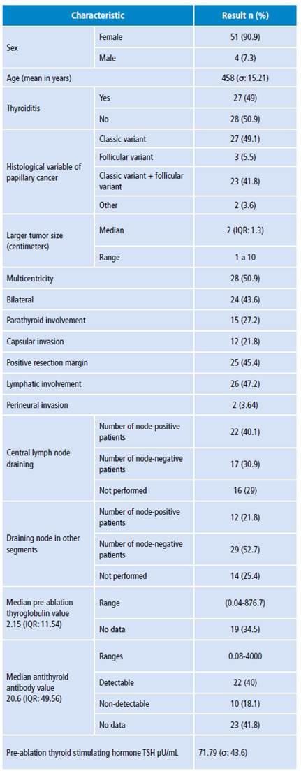 Between 2013 and 2015, 55 patients with papillary thyroid cancer were treated at San José Hospital; 92.7% were women with an average age of 45 years (σ: 14.6); in men, the average age was 59 years (σ: 18.26). None of the patients reported previous radiation exposure (Table 1).