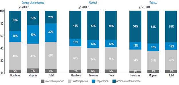 Frente a la prevalencia de consumo de drogas, la mayor proporción de los sujetos de la muestra se encontró en etapa de contemplación con 44%; en específico, los varones se encontraban en mayor porcentaje en la etapa de contemplación (46% vs. 40%, X2 p<0.001 ), seguido de acción/mantenimiento (33% vs. 23 %, X2 p<0.001 ). En relación con el consumo de alcohol, la mayoría se ubicó en la etapa de mantenimiento con 46%. Al comparar las etapas de cambio por sexo, se encuentra que las mujeres se ubican en un mayor porcentaje en la etapa de acción/mantenimiento (47% vs. 45%, X2 p<0.001), seguido de la etapa de contemplación (34% vs 38% X2 p<0.001).