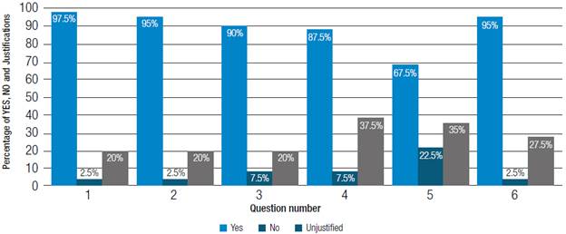 The survey yielded satisfactory results; the percentages of passing together with the percentage of unjustified questions can be seen in and failing grades obtained by students for each question asked, Table 4 and Figure 4.