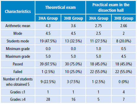 The results obtained were compared after being typed in a table. The amount of grades <3.0, the amount of grades between 3.0 and 3.9 and the amount of grades ≥4.0, both in the theoretical test and the practical test in the dissection hall, were retrieved (Table 1).