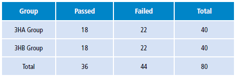 Each grade of the theoretical test obtained by a specific student was typed in a Microsoft Excel sheet, by means of which Figure 2 was generated; it is possible to see that the results of the 3HA group are notoriously higher than those of the 3HB group.