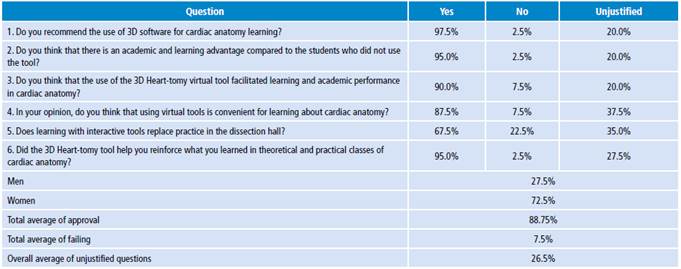 In addition, an opinion poll was conducted to evaluate the students' opinion of the impact of 3D Heart-tomy as an implementation of new technologies for teaching and learning about cardiac anatomy.