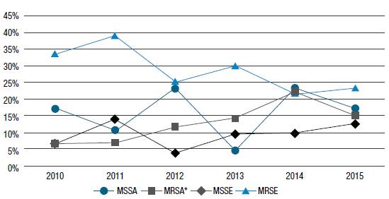 Tendencias de resistencia antimicrobiana en Staphylococcus aureus y Staphylococcus epidermidis resistentes y susceptibles a meticilina aislados, obtenidos en unidades de cuidados intensivos, 2010-2015