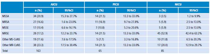 A total of 313 staphylococcal strains were isolated and identified, of which 63.6% (199/313; 95%CI 58.1- 68.7) were methicillin-resistant staphylococcal isolates (Table 1: MRSA+MRSE + other MR-CoNS). Said isolates were obtained from patients admitted to the adult ICU (AICU) (57.1%; 93/163; 95%CI: 49.4- 64.4), the neonatal ICU (NICU) (78.8%; 67/85; 95%CI: 69.0-86.2), and the pediatric ICU (PICU) (60.0%; 39/65; 95%CI: 47.9-71.0) (Table 1).