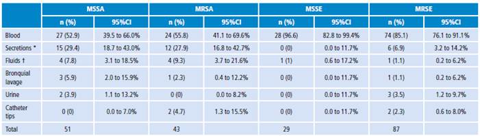 MSSA: methicillin-susceptible S. aureus; MRSA: methicillin-resistant S. aureus; MSSE: methicillin-susceptible S. epidermidis; MRSE: methicillin-resistant S. epidermidis. * Secretions: orotracheal, ocular and other secretions. † Fluids: pleural, peritoneal and other fluids. Source: Own elaboration.