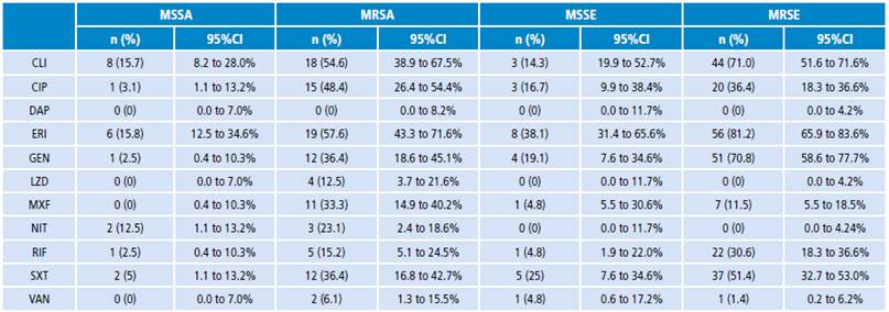 MSSA: methicillin-susceptible S. aureus; MRSA: methicillin-resistant S. aureus; MSSE: methicillin-susceptible S. epidermidis; MRSE: methicillin-resistant S. epidermidis; CLI: clindamycin; CIP: ciprofloxacin; DAP: daptomycin; ERI: erythromycin; GEN: gentamicin; LZD: linezolid; MXF: moxifloxacin; NIT: nitrofurantoin; RIF: rifampin; SXT: trimethoprim-sulfamethoxazole; VAN: vancomycin. Source: Own elaboration.
