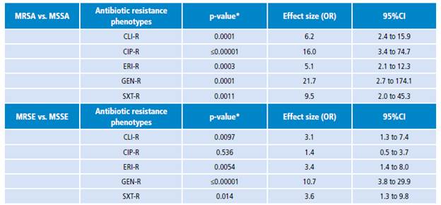 MSSA: methicillin-susceptible S. aureus; MRSA: methicillin-resistant S. aureus; MSSE: methicillin-susceptible S. epider-midis; MRSE: methicillin-resistant S. epidermidis; CLI-R: clindamycin-resistant; CIP-R: ciprofloxacin-resistant; ERI-R: erythromycin-resistant; GEN-R: gentamicin-resistant; SXT-R: trimethoprim-sulfamethoxazole-resistant. * p-values were estimated by means of Fisher's exact test. Source: Own elaboration.
