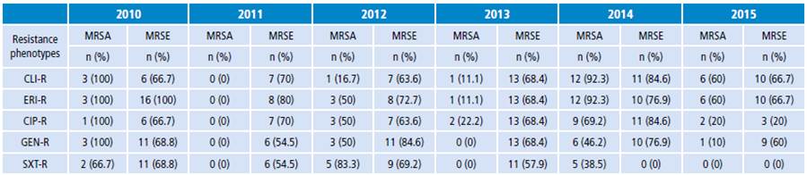Table 5: Trends of antimicrobial resistance phenotypes of methicillin-resistant and methicillin-susceptible Staphylococcus species isolates. 2010-2015.