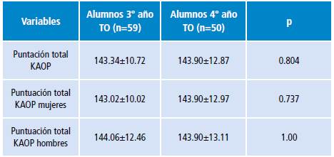 El grupo de 3° año estuvo compuesto por 41 mujeres y 18 hombres, mientras que en el grupo de 4° año había 40 mujeres y 10 hombres. El análisis estadístico indicó que no hay diferencias significativas en los promedios de los puntajes KAOP obtenidos según género en el grupo de 3° (p=0.737) ni en el de 4° (p=1.00). Se llevó a cabo una comparación de la puntuación total de la KAOP en función del género en cada grupo de estudiantes, encontrándose puntuaciones similares (p>0.05).