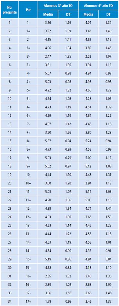 La escala la completaron de forma voluntaria 109 estudiantes de terapia ocupacional; la edad media de los participantes fue de 22.71±3.46 años y predominó el sexo femenino (74.30%). Las características descriptivas de los participantes por curso en el estudio se plasmaron en la Tabla 1.