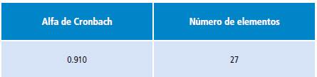 Los datos obtenidos se tabularon en el programa estadístico SPSS® versión 20.0 y posteriormente se realizó el análisis univariado de la información, obteniendo medidas de tendencia central. El análisis de confiabilidad se obtuvo mediante la aplicación del alfa de Cronbach del instrumento SERVQHOS aplicado a los 27 ítems para evaluar la calidad. El resultado fue 0.91 (Tabla 1), lo cual permitió estimar la consistencia interna del instrumento de evaluación aplicado e indicar un nivel óptimo de confiabilidad del mismo para medir la calidad percibida por el usuario en el servicio de cirugía ambulatoria.