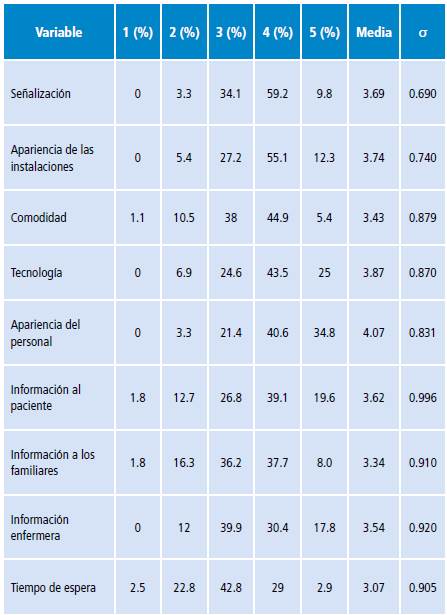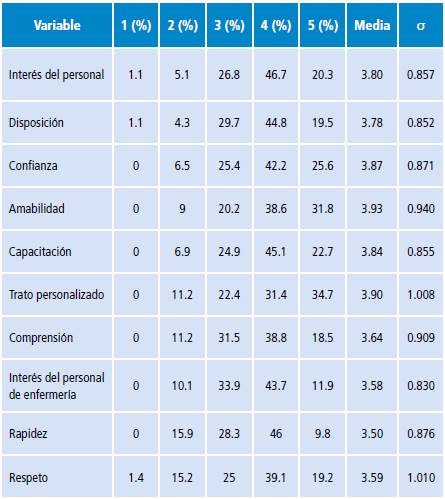Al analizar los datos arrojados por el instrumento, se observó que los aspectos mejor valorados por los usuarios con respecto a la calidad subjetiva fueron: la amabilidad del personal (media de 3.93), el trato personalizado al paciente (3.90) y la confianza que trasmite el personal que lo atiende (3.87), mientras que los aspectos con menor valoración fueron: el respeto a la intimidad del paciente (media de 3.59), el interés del personal de enfermería por los pacientes (3.58) y la rapidez con la que el paciente obtiene lo que requiere (3.50) (Tabla 2).