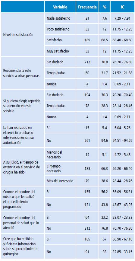 La satisfacción del usuario respecto a la calidad de los servicios de salud es una temática compleja que se relaciona con diferentes factores como la edad, el nivel educativo, la especialidad quirúrgica por la cual el paciente es atendido y el sistema de seguridad social en salud. Asimismo, la percepción del paciente en cuanto a la calidad de los servicios se ha convertido en un factor determinante para los planes de gestión en las instituciones de salud 24 de acuerdo con lo establecido por el Sistema Obligatorio de Garantía de la Calidad en Salud, integrado por los componentes de habilitación, auditoría, acreditación e información 25.